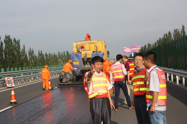 京張高速公路2015年路面微表處和標(biāo)線補(bǔ)劃工程經(jīng)過充分的施工準(zhǔn)備于8月6日正式開工。王啟成總工程師到施工現(xiàn)場檢查了施工情況,對工程的質(zhì)量控制和安全保暢工作表示滿意。本工程是今年迎國檢的重點(diǎn)施工項(xiàng)目之一,總投資249.94萬元,預(yù)計(jì)8月30日前全部完工。(王喜會(huì))。