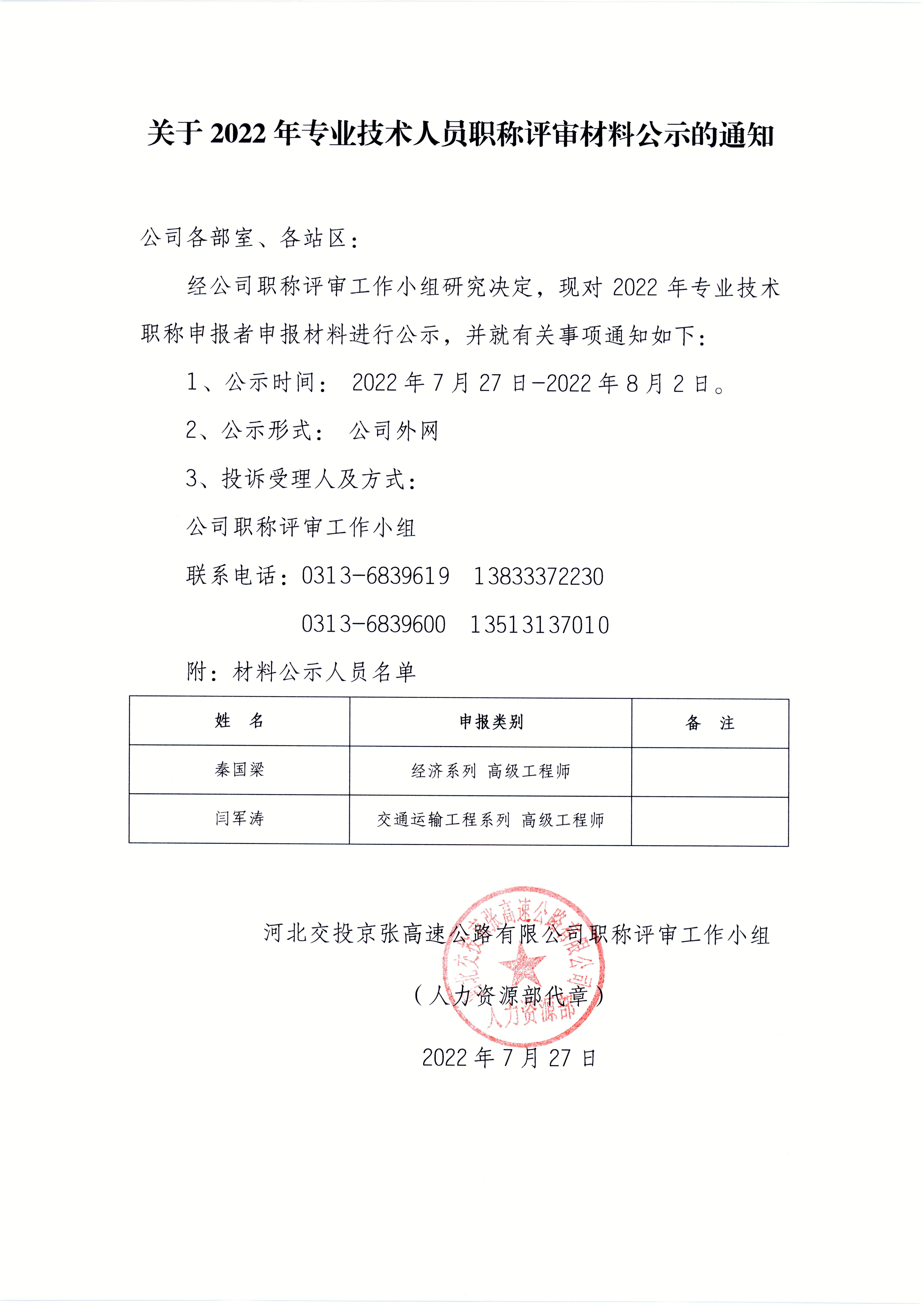 關于2022年專業(yè)技術人員職稱申報材料公示的通知