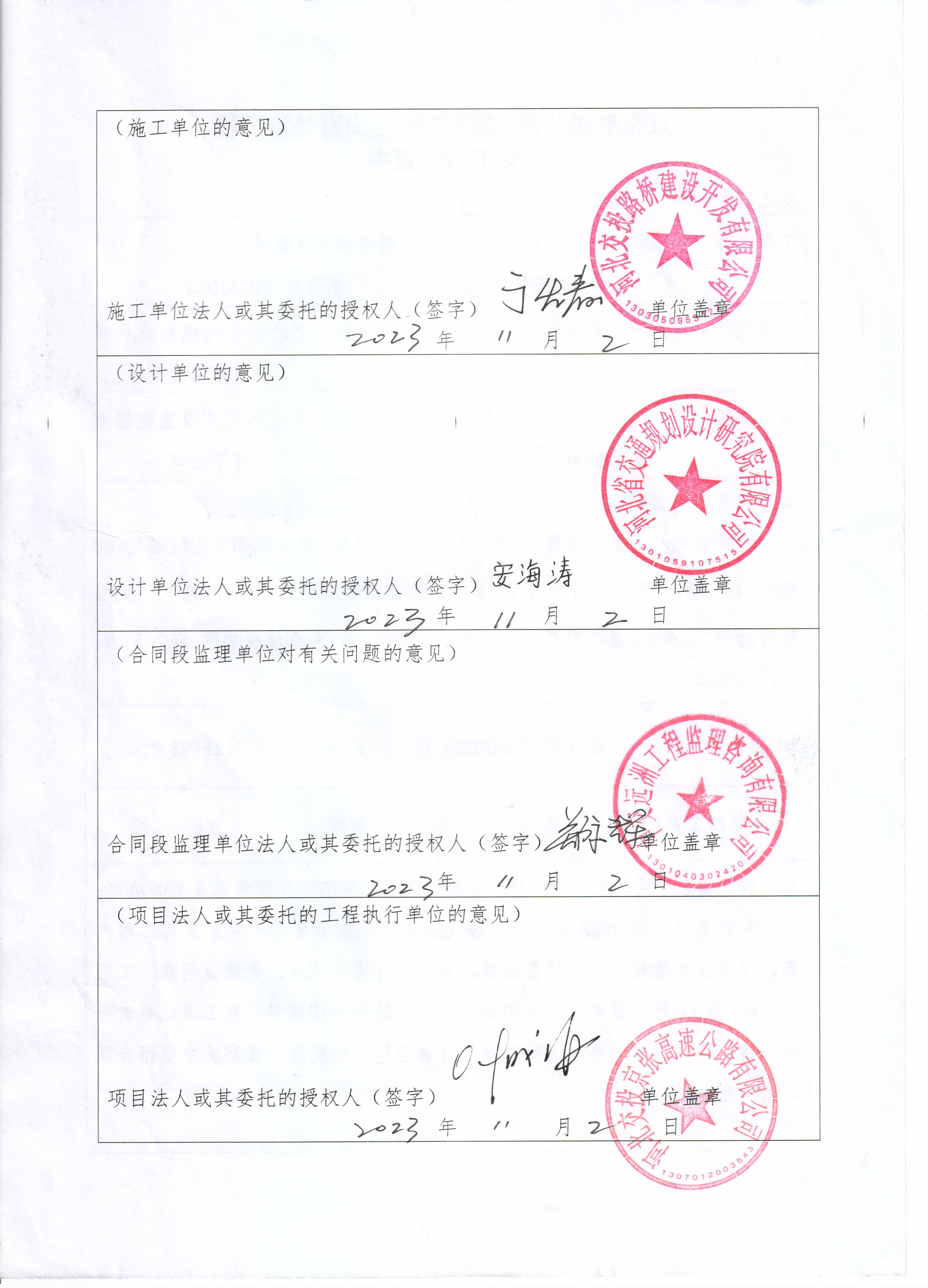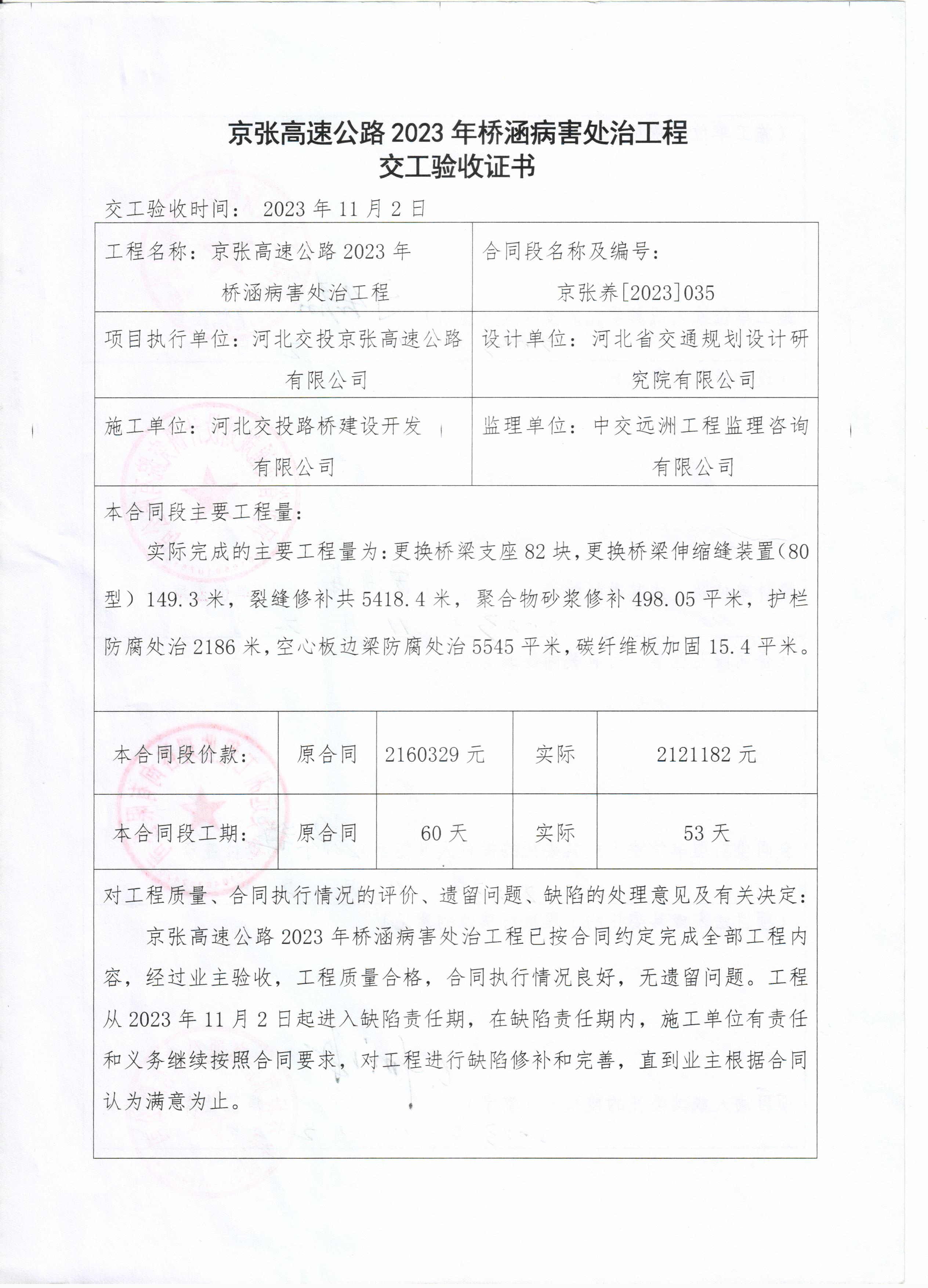 京張高速公路2023年橋涵病害處治工程交工驗(yàn)收證書(shū)